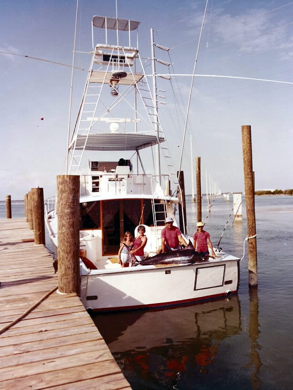 Walter and Ruth Starck bought the property known today as Robbie’s in the 1940s. In the summer of 1946, they started building a house. Later, Buck and his wife’s brother, Ellis Shires, built a bait and tackle store that Buck’s wife, Ruth, used to run. That store is known today as the Hungry Tarpon. Walter “Buck” Starck operated his fishing charter boat WAS (Walter A. Stark) out of the small marina. In this image, the WAS can be seen leaving Starck’s marina. Buck is at the helm, and President Harry S. Truman is sitting in the back wearing a white hat. The famed news broadcaster Edward R. Murrow is also on board the charter boat.